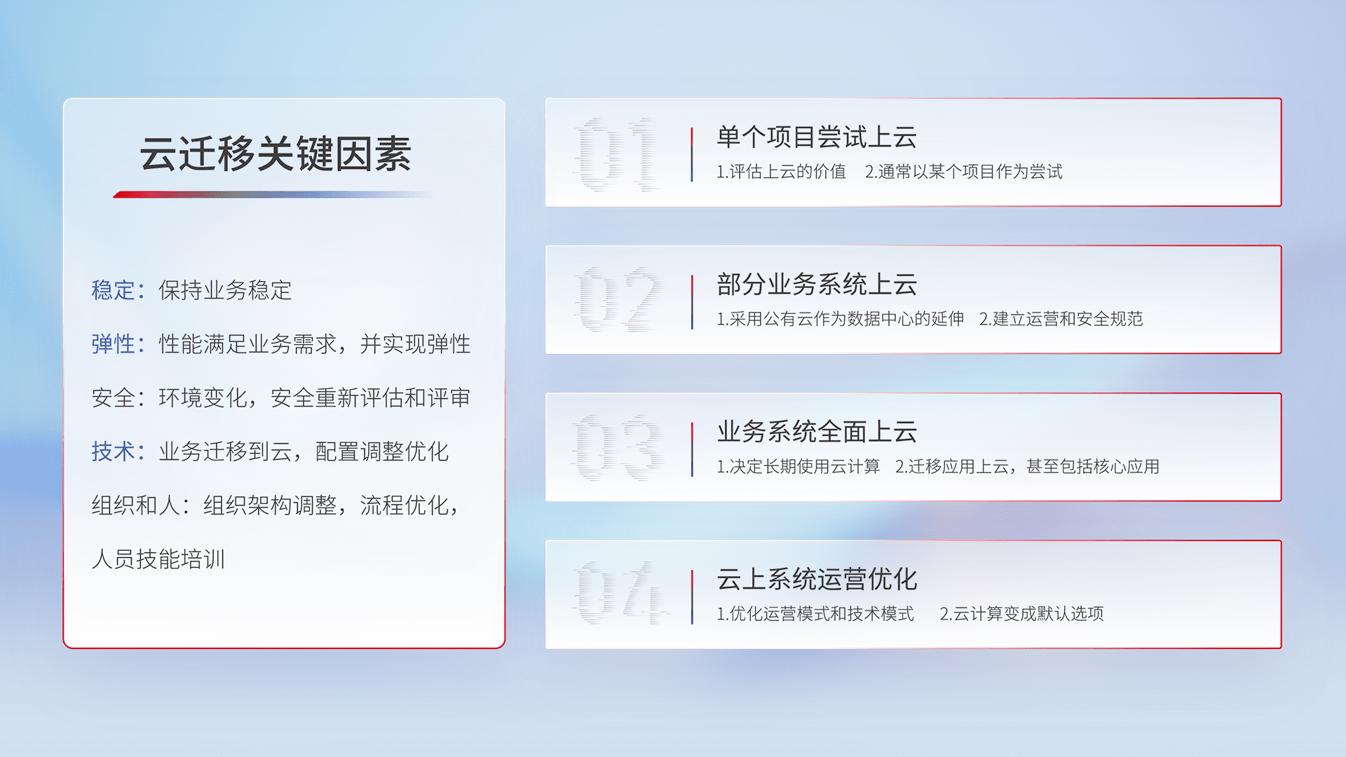 结合实际业务,,,,从规划设计、、云平台选型、、云原生改造、、、、数据迁移、、、集成交付,,迁移全过程为客户识别最佳上云路径,,做好风险识别管理,,,,设计网络架构、、身份权限、、安全审计合规、、、、操作审计、、、、日志审计、、、、监控告警策略、、多站点容灾设计等,,,对云上基础设施进行整体规划,,提升IT治理水平,,,,以满足弹性、、、、高可用、、、、高性能的需求。。。。