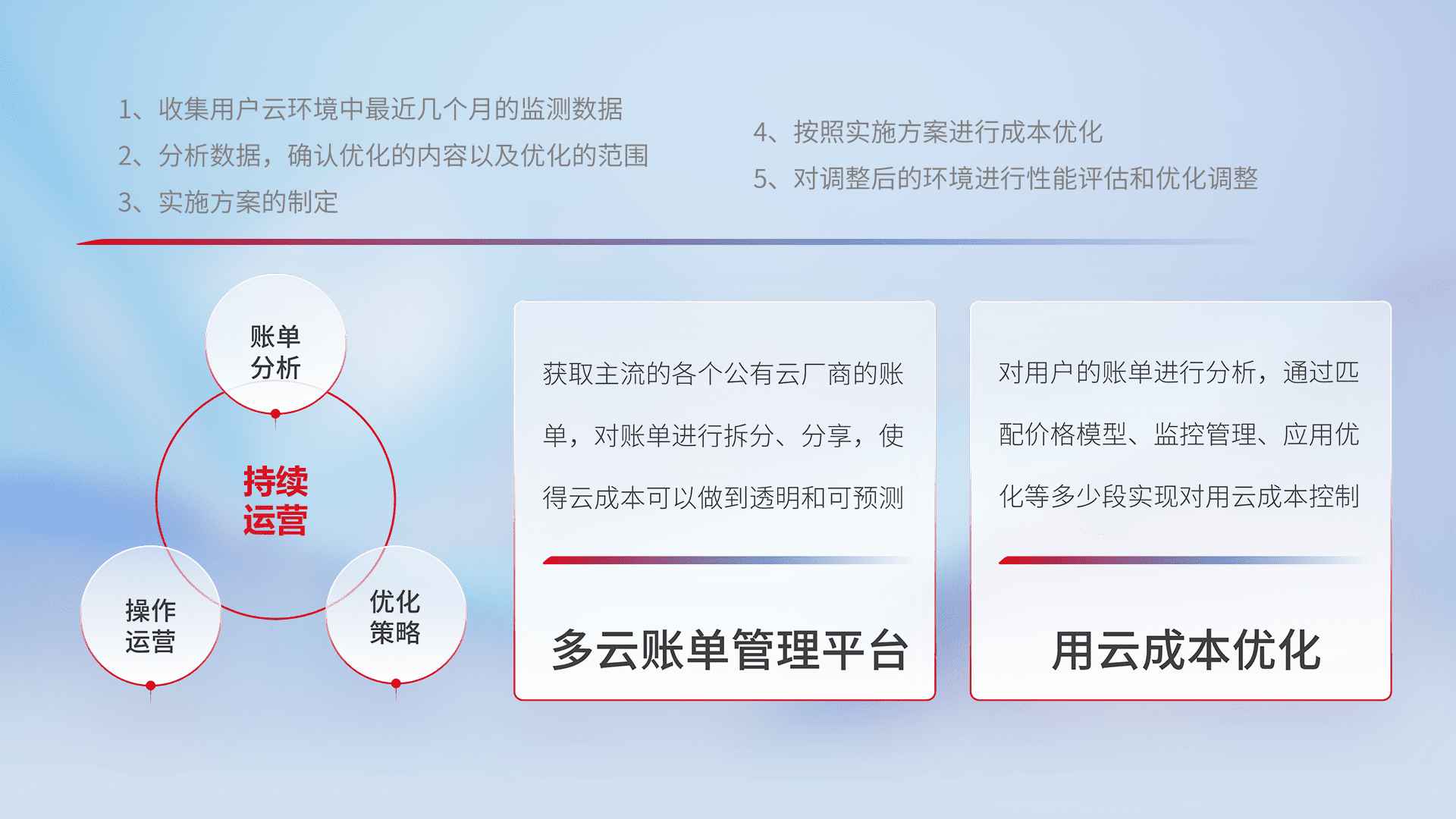 通过多云纳管,,,以统一的资源数据模型把客户的云资源进行抽象和封装,,,进而实现对多云资源的统一操作,,保障云资源管理的可靠性、、稳定性与可用性。。。量身定制化运维内容,,配置、、、开发运维、、、补丁管理、、、备份、、、监控、、、、认证和访问管理、、、、审计和日常巡检等,,保障在用云过程中的可靠度,,稳定度以及高可用率。。。。